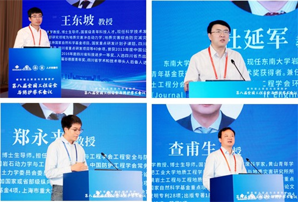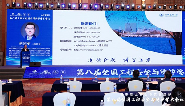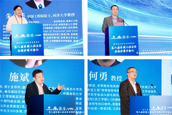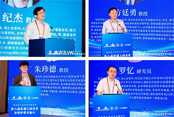 大会特邀报告环节由同济大学朱合华院士、北京建筑大学戚承志教授、南京大学施斌教授、南京理工大学何勇教授、中国科学技术大学纪杰教授、阜阳师范大学方廷勇教授、河海大学朱珍德教授和武汉大学罗忆研究员分别做题为:"智慧基础设施数字底座建设及其实践""颗粒介质受载力链演化的力学模型""岩土体灾变感知与应用""新型爆炸毁伤与韧性防护技术""隧道火灾烟气流动特性及控制方法""城乡建设安全发展"安徽模式"""极端环境下干热岩体渗流网生成智能演化理论研究"与"复杂应力路径下双江口花岗岩破坏特征及能量演化机制"的大会报告。