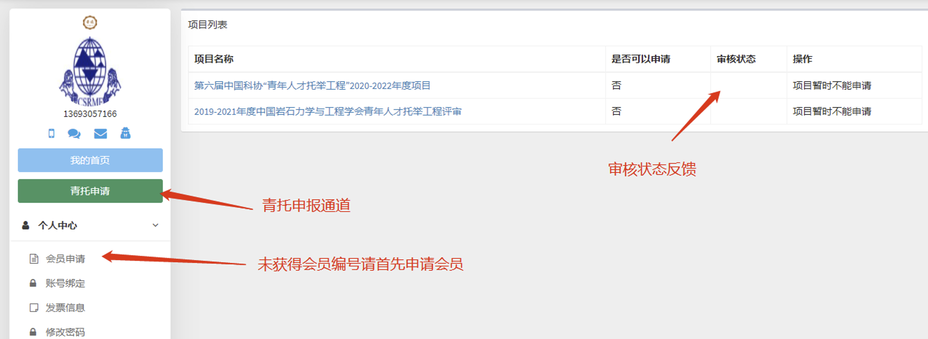 1. 首先登陆学会会员系统(http://www.csrme.com/会员服务——>会员中心——>会员注册登录),申报人员须是注册缴费学会会员拥有会员号,其他条件及要求请参见学会网站申报工作通知。