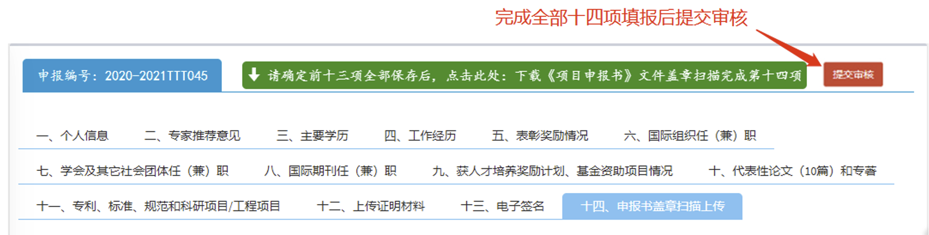 5. 审核通过后,下载打印《项目申报书》(一式2份),按要求签字盖章后,扫描上传(纸质材料暂不邮寄)。导出的word申报书不包含七、八、九、十、十一项填报内容,这几项内容为网评数据项。