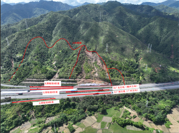 国家重大工程大广-龙连高速公路元善互通巨型滑坡防治工程简介 元善枢纽互通位于广东省河源市连平县,是连接大广高速公路与龙连高速公路的立交互通。2022年6月中上旬,元善镇连降暴雨导致大广高速及龙连高速元善互通路面出现严重病害。路面产生最大约50cm的横向隆起错裂,造成南、北行线均呈现明显的波浪状形态;在长约500m的路面范围内出现多条纵向裂缝,护栏发生明显倾倒、扭曲;大广高速北行线与龙连高速H匝道间挡墙外倾开裂严重,裂缝长度达3-4cm;此外北侧局部坡体泥浆越过挡墙顶面上道,坡面框架出现严重破坏,山体也明显开裂下错,该病害对过往车辆运行平稳性及安全性造成巨大影响。经勘察,该滑坡体滑面从高速路基下穿过,对元善枢纽互通及大广主线K3232+970~K3232+520段线路安全构成极大威胁。