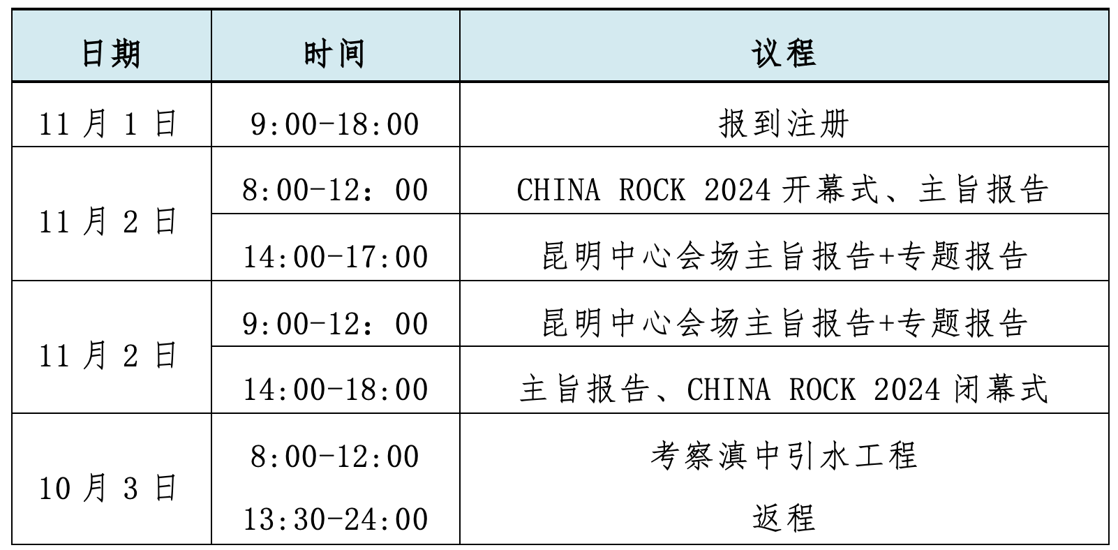 为了加强我国岩石力学与工程领域的学术交流,促进岩石力学与岩土工程领域科技创新,经研究决定,于2024年11月1-3日召开CHINA ROCK 2024 第二十一次中国岩石力学与工程学术年会。为更好地秉承“规模化、国际化、一体化”办会精神,服务好广大岩石力学与工程相关领域在校学生和青年会员,设立“主会场+中心会场+卫星会场”三级会场,成都设置主会场和分会场,在成都外设置各地中心会场,主会场及中心会场下设若干个卫星会场。其中,在昆明市设立CHINA ROCK 2024昆明中心会场。现将会场有关事项通知如下: