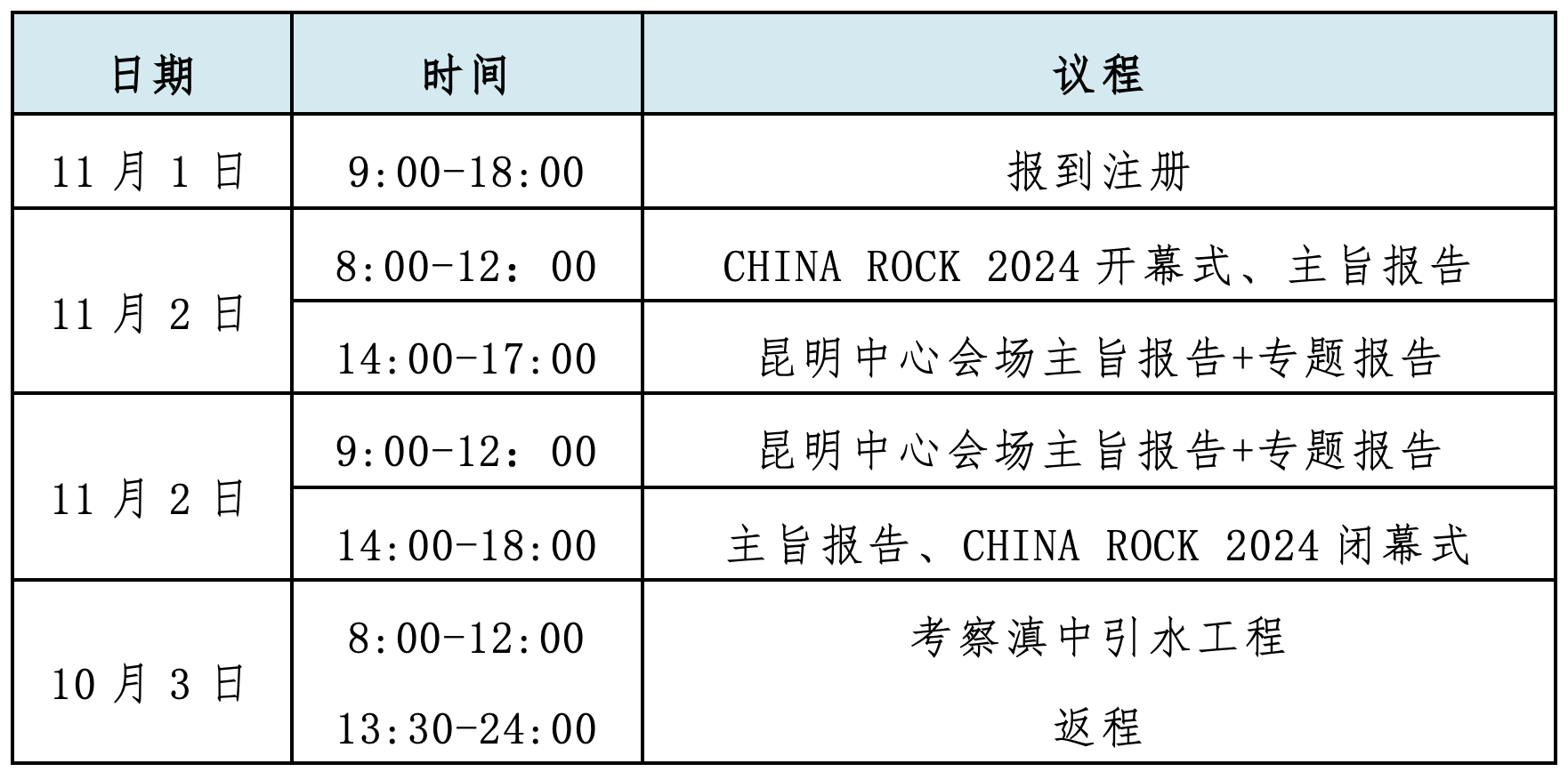 为了加强我国岩石力学与工程领域的学术交流,促进岩石力学与岩土工程领域科技创新,经研究决定,于2024年11月1-3日召开CHINA ROCK 2024 第二十一次中国岩石力学与工程学术年会。为更好地秉承“规模化、国际化、一体化”办会精神,服务好广大岩石力学与工程相关领域在校学生和青年会员,设立“主会场+中心会场+卫星会场”三级会场,成都设置主会场和分会场,在成都外设置各地中心会场,主会场及中心会场下设若干个卫星会场。其中,在昆明市设立CHINA ROCK 2024昆明中心会场。现将会场有关事项通知如下:
